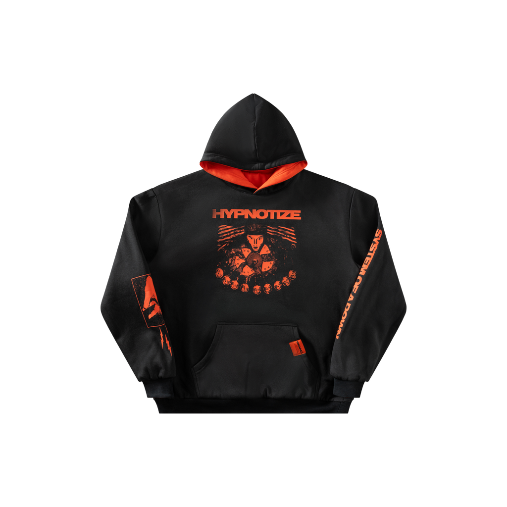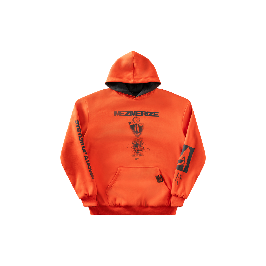 Custom heavyweight, fully reversible pullover hoodie in a saturated red-orange and black, featuring Hypnotize artwork on one side, Mezmerize on the other, woven labels, and embroidery on the hood. Constructed from 80% cotton, 20% recycled polyester.